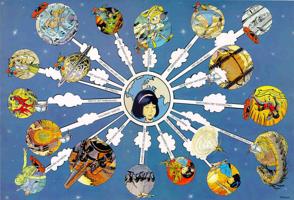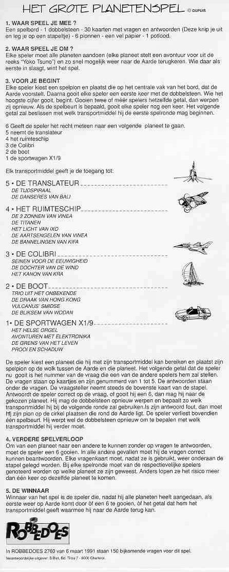 PLANETENSPEL Het grote planetenspel zat een tijdje bij het album 'De Bannelingen van Kifa'. Maar is nu blijkbaar niet meer te verkrijgen. Bij het spelbord horen een hele hoop (150) vragen en in die tijd stonden er in Robbedoes (Spirou) ook nog eens 150 vragen. Ik zal proberen beetje bij beetje deze vragen op de site te plaatsen. Download een grote afbeelding van het spelbord |